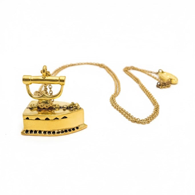 El Collar Plancha Antigua es una joya que rinde homenaje a los oficios, a la memoria y al valor del trabajo hecho a mano. Su colgante reproduce una plancha antigua en miniatura, símbolo de precisión, dedicación y belleza en los pequeños detalles.