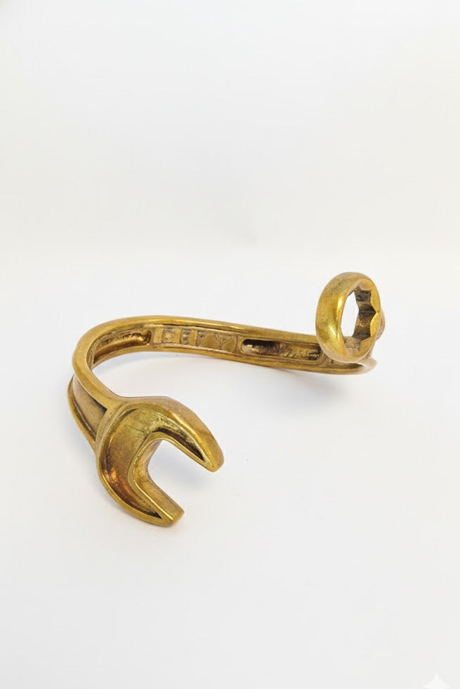 La pulsera con forma de llave fija es una joya de carácter industrial y espíritu rebelde. Forjada en metal con acabado dorado envejecido, su diseño reproduce una llave inglesa abierta en un extremo y una tuerca en el otro, simbolizando la fuerza, la independencia y la ruptura de lo convencional. Una pieza que trasciende el concepto de accesorio para convertirse en declaración de actitud: desafía las normas, crea tu propio camino.