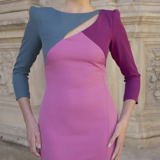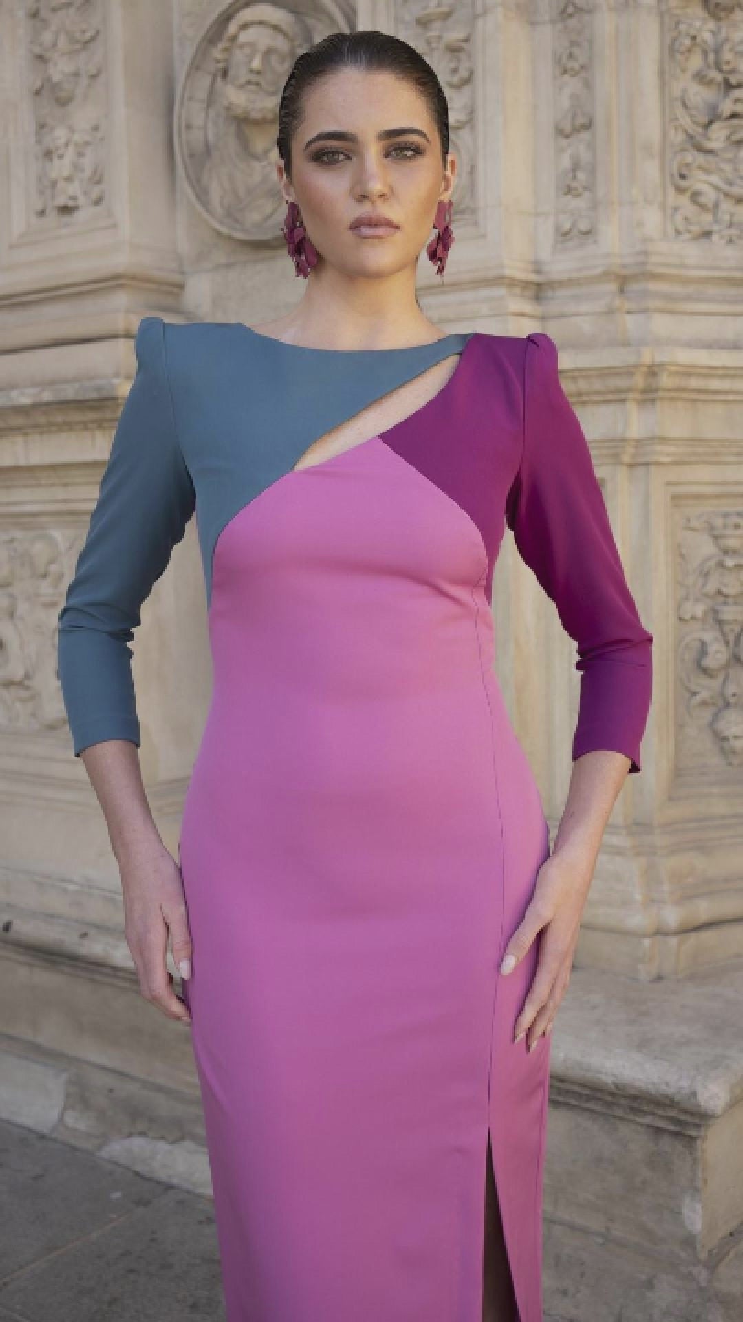 El vestido Alba representa la elegancia invernal en su forma más contemporánea. Su combinación cromática en tonos Purpura, burdeos y azul petróleo crea una armonía visual impactante y sofisticada, perfecta para deslumbrar en cualquier evento invernal.