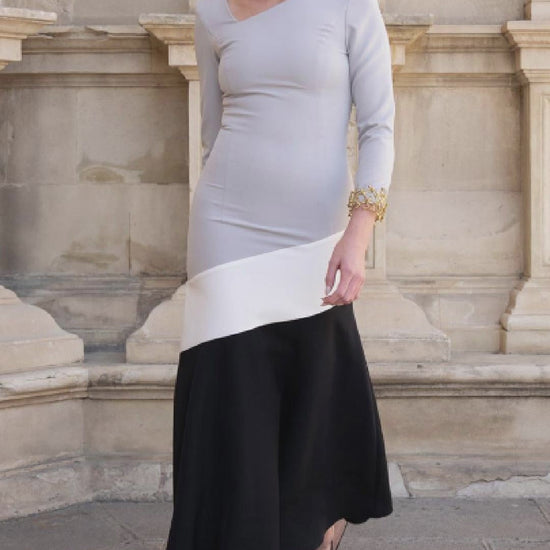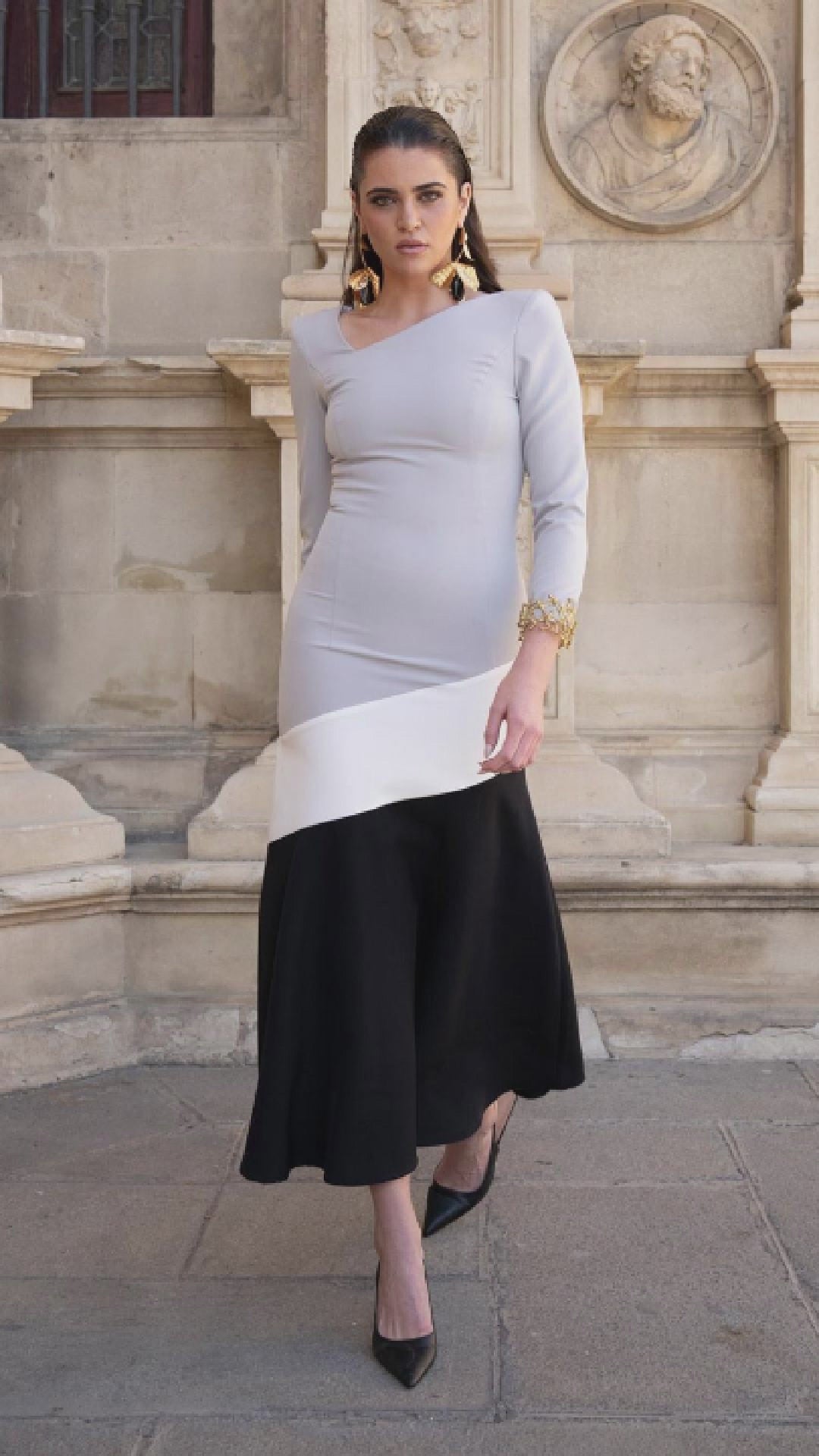 Un diseño que redefine la elegancia invernal. El vestido AURA fusiona una silueta entallada con una falda evasé en largo midi que aporta movimiento y feminidad. La combinación de tonos neutros, gris perla en la parte superior y negro profundo en la falda, crea un contraste atemporal y sofisticado que lo convierte en un imprescindible para eventos de invierno.